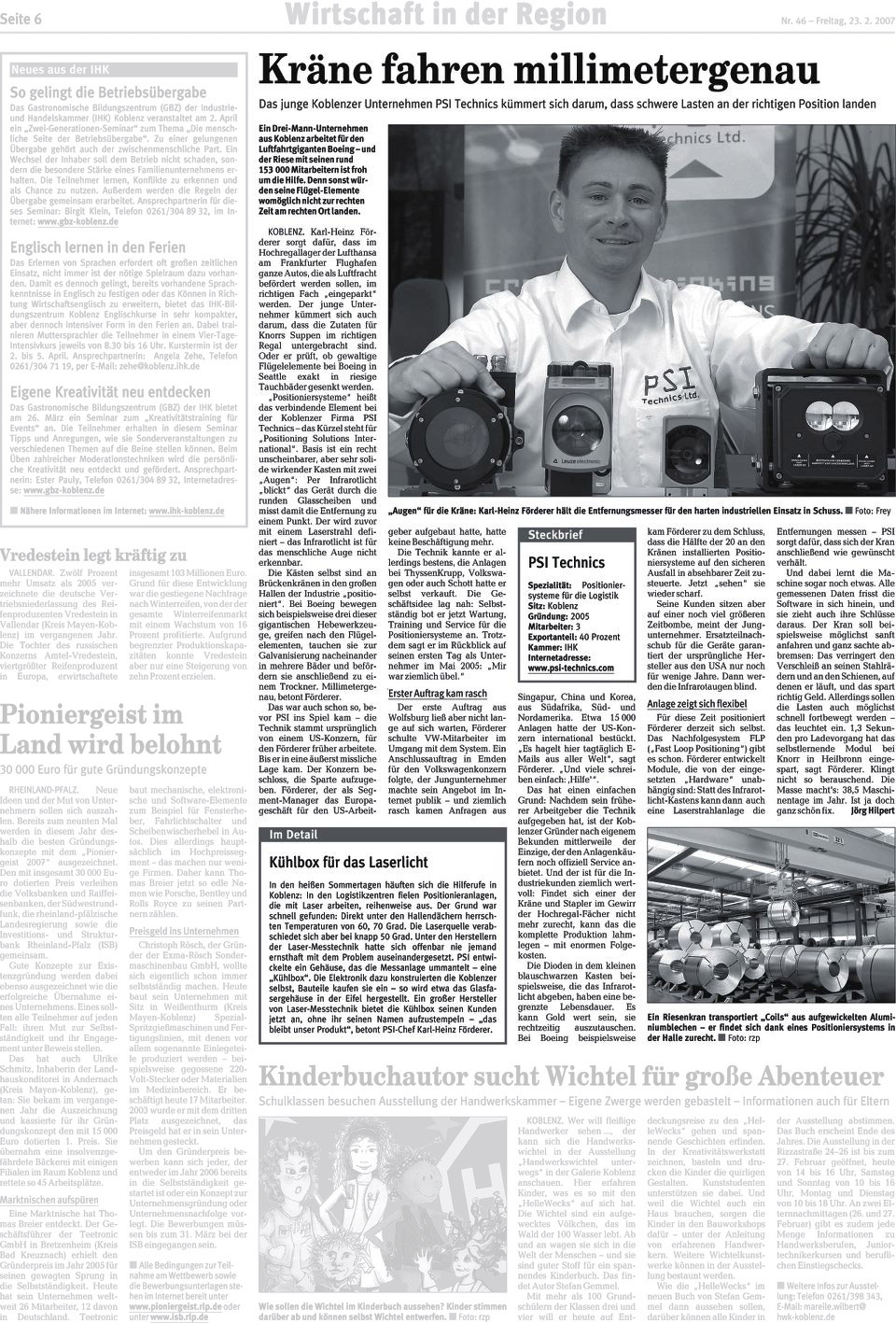 [...] Karl-Heinz Förderer sorgt dafür, dass im Hochregallager der Lufthansa am Frankfurter Flughafen ganze Autos, die als Luftfracht befördert werden sollen, im richtigen Fach "eingeparkt" werden. Der junge Unternehmer kümmert sich auch darum, dass die Zutaten für Knorrs Suppen im richtigen Regal untergebracht sind. Oder er prüft, ob gewaltige Flügelelemente bei Boeing in Seattle exakt in riesige Tauchbäder gesenkt werden. "Positioniersysteme" heißt das verbindende Element bei der Koblenzer Firma PSI Technics - das Kürzel steht für "Positioning Solutions International". [...]