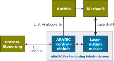 Das neue System erhält per Wegmessung den Absolutwert der Position des Krans, verarbeitet diese Angabe in der internen Regelung und spricht die Aktorik (Antrieb) mit dem resultierenden Ausgabewert an, um die Mechanik des Systems an die gewünschte Position zu bringen. Die Befehle zur Positionierung werden z. B. per Feldbus oder seriell per ASCII-Protokoll von einer Prozesssteuerung an das ARATEC gerichtet. Mithilfe von Status-Codes liefert die Kommunikationsschnittstelle eine transparente Darstellung aller Systemzustände. Die Kommunikation findet ausschließlich über standardisierte Protokolle und Schnittstellen statt.