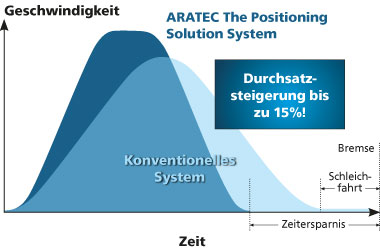 Die Funktionen des ARATECs erschöpfen sich nicht in der Wegmessung, sondern optimieren auch den zeitlichen Ablauf. Das System berechnet aus der maximalen Beschleunigung und Geschwindigkeit und aus dem zurückzulegenden Weg ein Bewegungsprofil. Schleichfahrten werden vermieden. Im Beschleunigungs- und Geschwindigkeitsverlauf gibt es - unabhängig von der Last - nur lineare Rampen. Die Bewegungen der Anlagen lassen sich äußerst schnell beenden und die Zeiten für Einlagerung und Auslagerung werden erheblich verkürzt. Die dynamische Parametrierung erlaubt eine Anpassung und Neueinstellung von Beschleunigung, Geschwindigkeit und Toleranz auch während der Bewegung.