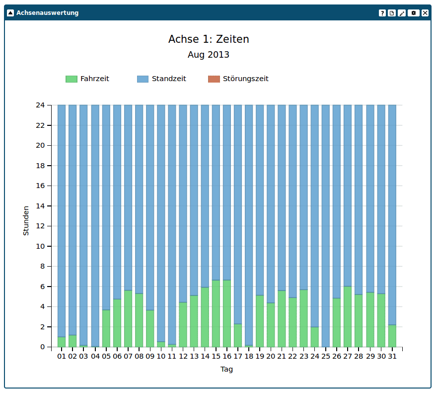 Verschiedene Datentypen können in Widgets angezeigt und miteinander verglichen werden. Als Widgets werden eigenständige Fenster innerhalb der Dashboard-Seite bezeichnet. Damit können auf einen Blick unterschiedliche relevante Daten ersichtlich werden. So kann zum Beispiel ein Vergleich zwischen Fahr- und Stillstandszeiten der verschiedenen Achsen eines Regalbediengerätes Informationen darüber liefern, wie der Prozess optimiert werden kann oder wie die Auslastung der verschiedenen Anlagen ist.