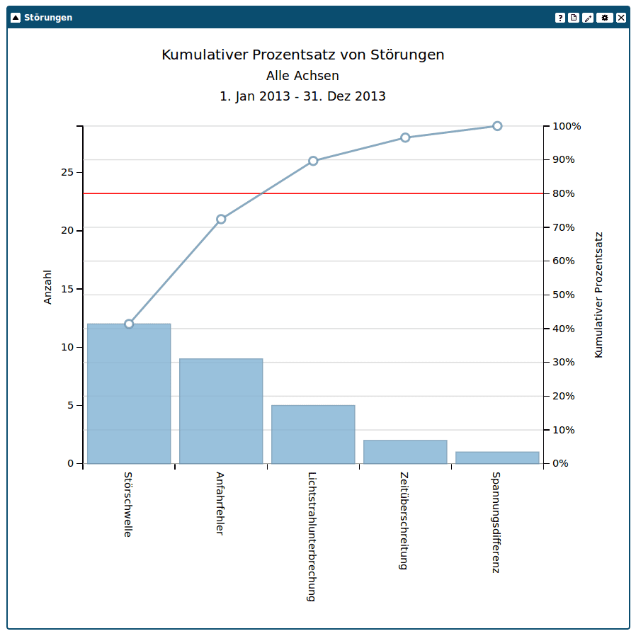 Störungen können visualisiert und Informationen vom Bediener erweitert werden. Über ein Pareto-Diagramm werden die Störungsursachen nach Häufigkeit sortiert. So kann ein Konzept zum Vorgehen bei der Prozessoptimierung nach dem Pareto-Prinzip erstellt werden.